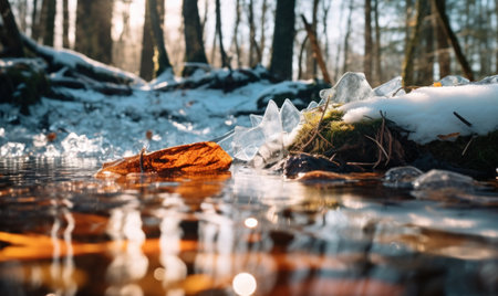 Glistening ice fragments line the tranquil river as the sun sets, casting warm hues across the water. Spring awakens nature, creating a serene atmosphere filled with hope and renewal.