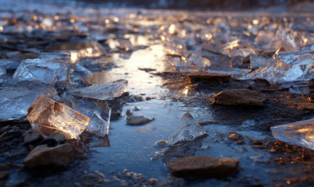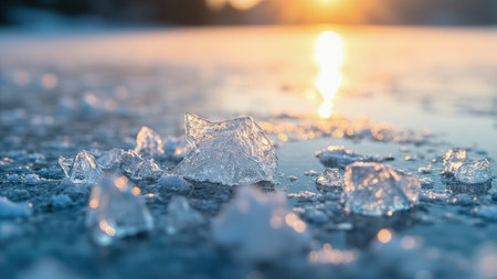 Ice shards on water with a golden sunset creating a warm glow and a cool blue tone.