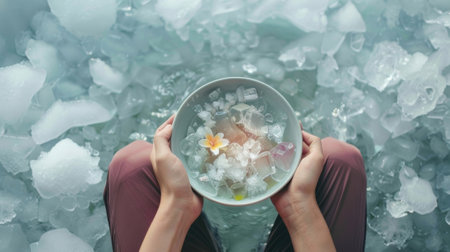 A person sitting crosslegged in an ice bath holding a bowl of aromatic oils and breathing in their soothing scents