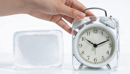 Alarm clock frozen in ice cube on white background, time concept