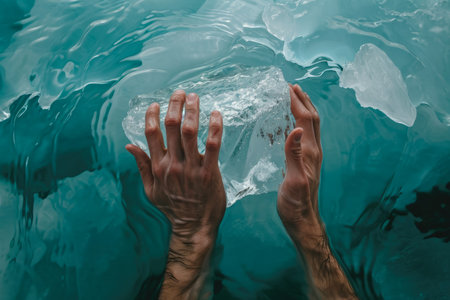 A man trying to grab onto a piece of floating ice, with his hands slipping.