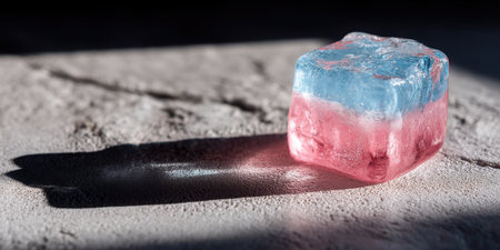 A vibrant ice cube showcases layered blue and pink colors, casting a soft shadow on a textured surface, perfect for summer beverage themes.