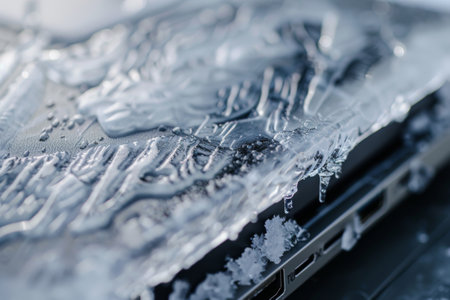 Frost and ice crystals form an intricate pattern on the surface of a laptop, capturing the essence of winter. The cold atmosphere creates a striking contrast against the tech device.