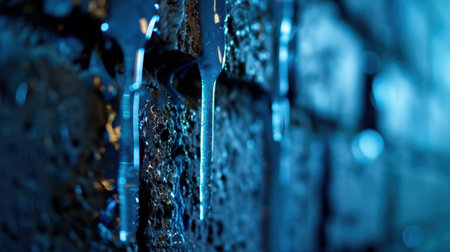 Captivating close-up of hanging icicles, featuring intricate textures and blue lighting against a dark stone wall. Perfect for winter designs.