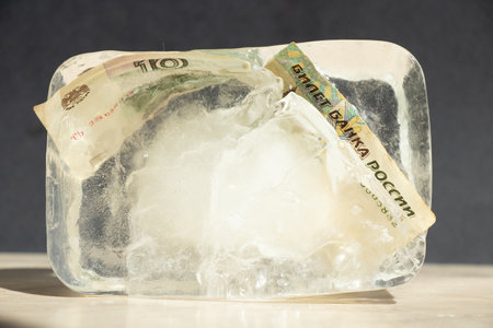 Ten Russian rubles in an ice cube close-up, frozen Russian money, sanctions