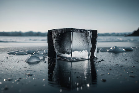 A beautiful, warm sunset over the ocean is captured and preserved within the cold, crystalline structure of a single ice cube.