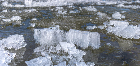 Drifting spring ice pieces on the river. Early spring background. Texture of floating ice.