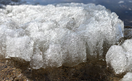 A closeup of transparent shining clear ice sparkling on frozen wild lakeshore great for background