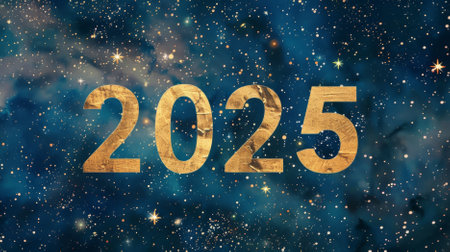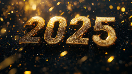 Golden 3D numerals of 2025 shine against a dark, sparkling background with confetti, symbolizing new beginnings, joy, and celebrations for the upcoming year filled with hope and excitement