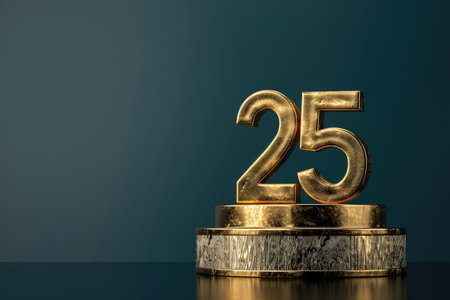 A golden number twenty-five sits on a pedestal against a dark green background.