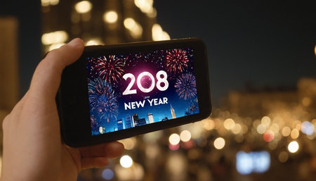 A hand holds a smartphone horizontally, displaying a vibrant New Year's Eve scene. The screen a city skyline with illuminated buildings at night, set against a dark sky filled with colorful fireworks in red, blue, and white. The text 208 NEW YEAR is prominently displayed in white. The background is blurred with bokeh lights, suggesting an outdoor celebration.