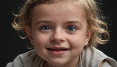 Surprised young caucasian child with curly hair and blue eyes in natural setting.