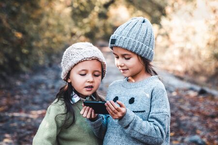 Children in the background of nature play with a smartphone. Watch the video and have fun. Friendship