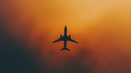 An airplane is seen flying against a stunning orange and dark sky at sunset while leaving a trail of smoke.