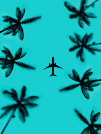 Airplane silhouette flying over tropical palm trees against against vibrant turquoise sky. Creative summer vacation concept. Minimal travel and holiday composition. Flat lay, view from bellow.