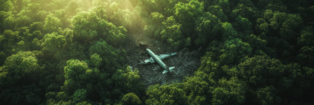 A large passenger plane in a forest in a remote area, aerial view