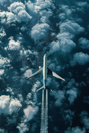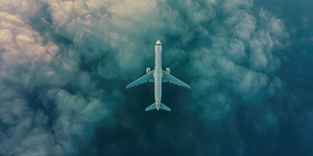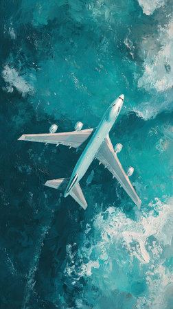 An airplane soars above the turbulent ocean waters captured in an overhead perspective. The image showcases a stylized aesthetic with a mix of blue and white colors. It might be useful for illustrating concepts of travel, transportation, or exploration, and possibly for various design projects.