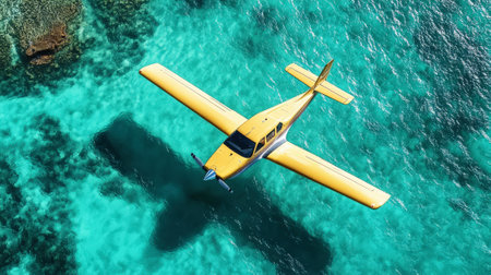 Small yellow private jet over the ocean turquoise blue water. Commercial flight, holiday tropical concept. Generative AI.