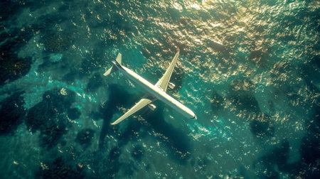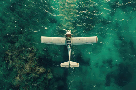 Aerial view of a small airplane in the sea. View from above.
