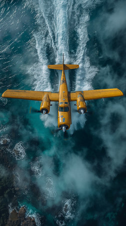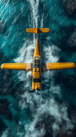 Aerial view of a yellow airplane in the middle of the sea