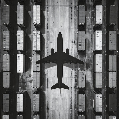 A striking black and white aerial view captures the silhouette of an airplane casting its shadow over a vast yard of shipping containers.