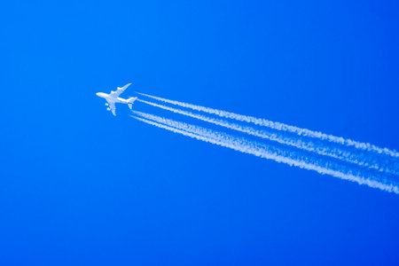 An airplane flies across a vibrant, blue sky, creating distinctive white vapor trails. The composition features a dynamic diagonal line created by the jet's contrails. The image showcases the aircraft and the trails against a backdrop of clouds. This image could be used for various commercial or editorial needs.