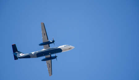 Russia. Khabarovsk - February 2020: Plane in flight (Bombardier DHC 8-Q300)
