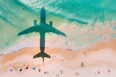 Planes shadow cast on a busy beach in summer