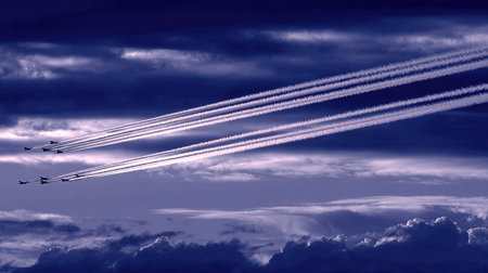 Airplanes in the sky with clouds in the background, toned