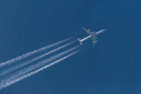 a passenger plane in the blue sky leaving traces behind