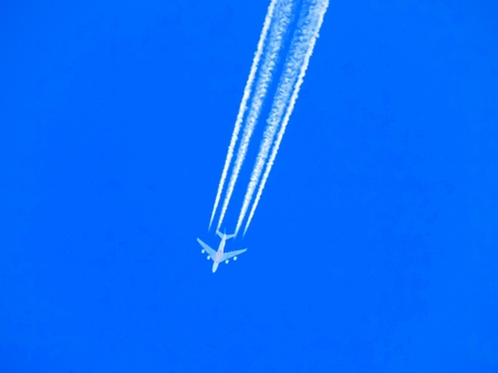 Airplane with chemtrails on blue sky