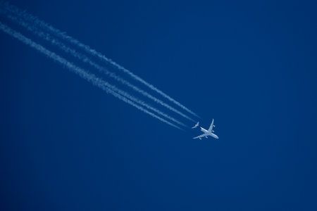 High-Altitude Airplane Leaving Contrails Across Clear Blue Sky