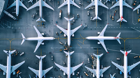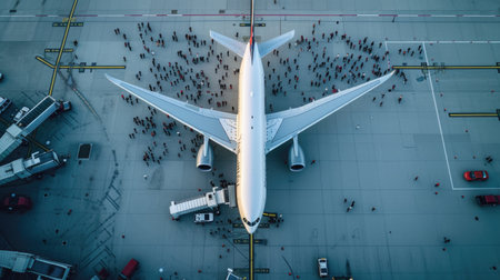 A bird's-eye view of an airplane parked at the gate in a bustling airport, with ground crew and vehicles preparing for departure.