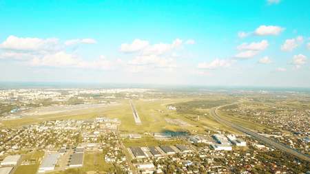 Travelling aerial shot of Warsaw international airport, Poland