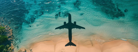 An overhead view of a tropical beach with clear turquoise water and white sand. A large airplane shadow cast by the midday sun is visible in the water.