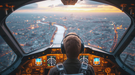 Pilot navigating aircraft over city at dusk. Generative AI