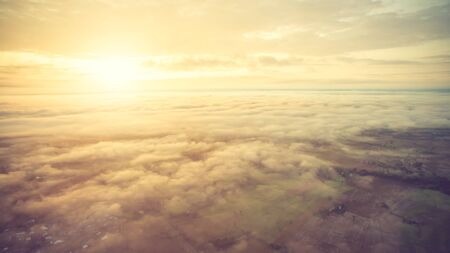 Beautiful sunset cloudy sky from aerial view. Airplane view above clouds