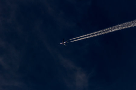Experience the freedom of flight as a sleek jetliner cruises through the endless expanse of a deep blue sky, leaving a trail of white contrails. Evokes travel, adventure, and global connection.