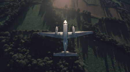 An aerial shot capturing an airplane soaring over lush green fields and forests during sunset, showcasing the harmonious blend of nature and aviation.