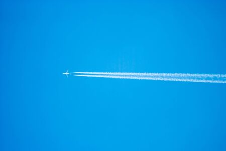 Airplane in the blue sky with contrails. Travel concept.