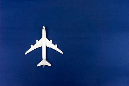 Model plane,airplane on blue pastel color background with copy space.Flat lay design.Travel concept on blue background. top view