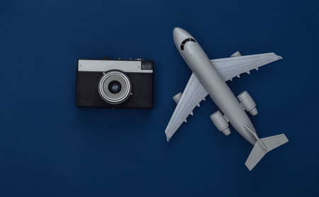 Plane figurine, camera on classic blue background. travel concept. Color 2020. Top view.