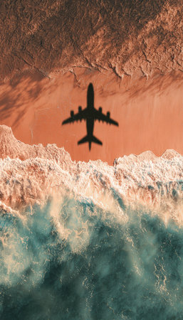 Aerial photograph capturing an aircraft's shadow on warm sandy shores with gentle waves. The image features a nostalgic retro-summer aesthetic and soft pastel color grading.