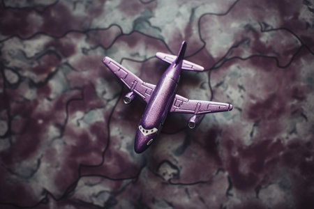 Plane toy on map background. Travel concept. Selective focus. Toned.