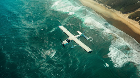 3D aerial view of a seaplane flying over the ocean.