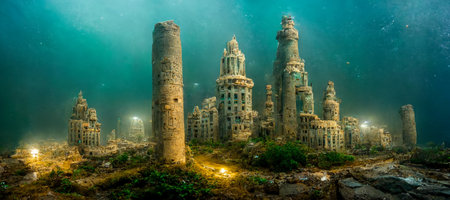 Stone columns emerge from the sandy ground, revealing an ancient civilization. Bright sunlight illuminates the ruins, creating a mystic atmosphere in the vast desert.