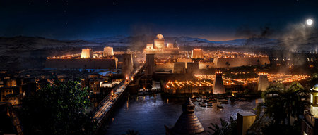 Panoramic view of an ancient Egyptian city at night