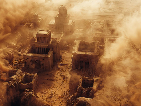 Majestic ancient ruins stand amidst golden sands with towering walls and palm trees under a colorful sky.