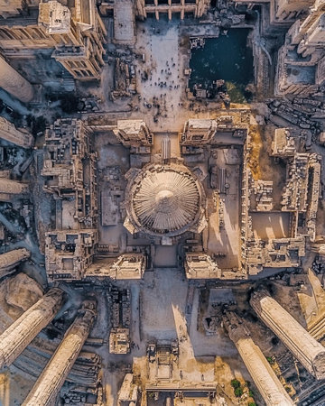 Ancient Temple Ruins of Lebanon. Vintage Style Photo of Baalbek. Majestic Old Columns over Cloudy Sky Background.
