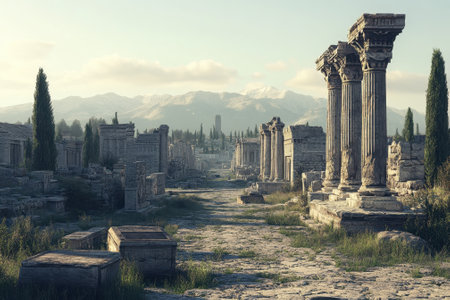 Crumbling columns and stone structures stand amidst lush greenery, against a backdrop of distant mountains.